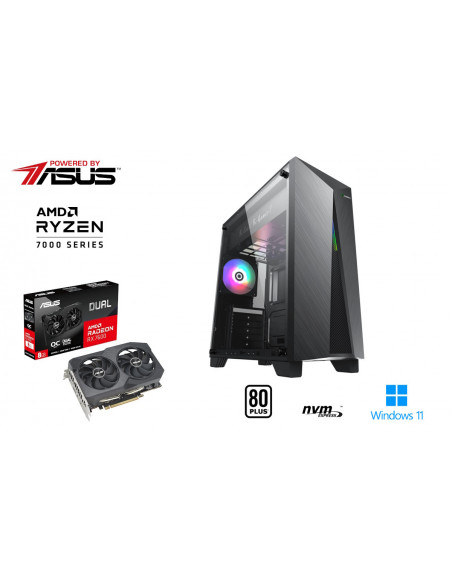 O Computador Gaming INSYS PbA é um PC de alto desempenho, ideal para gaming. Apresenta um processador AMD Ryzen 5 7600, placa gráfica ASUS RX 7600 8GB, 8GB de memória RAM DDR5 e um SSD NVMe de 512GB. Vem equipado com Windows 11.