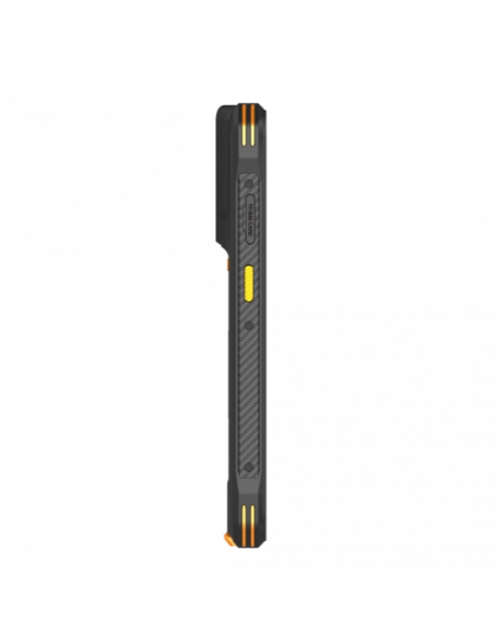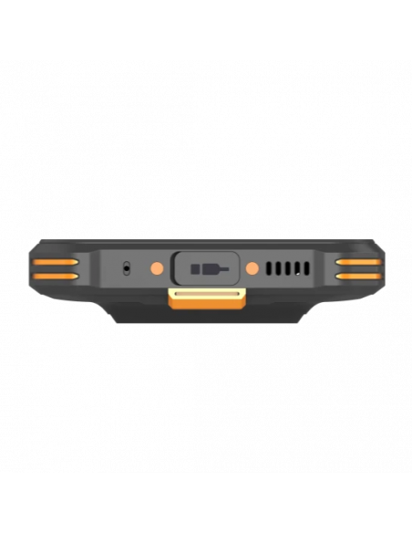 Em termos de robustez, o EM5-H68T é projetado para resistir a quedas de até 1.5 metros e opera em temperaturas de -20 °C a 60 °C, com temperatura de armazenamento de -30 °C a 70 °C, e humidade até 95% (não condensável). Possui certificação IP68 e MIL-STD-810H, garantindo resistência à água, poeira e impactos. A interface I/O inclui USB Tipo-C, Pogo Pin para carregamento e ranhuras para cartões (2 de 3: Micro SIM + TF ou Micro SIM + Nano SIM). Dispõe de um scanner integrado 1D/2D e teclas de leitura de código de barras. Conta também com botões físicos, como Power e Leitor de Impressões Digitais, Volume +/-, e teclas de leitura de código de barras.